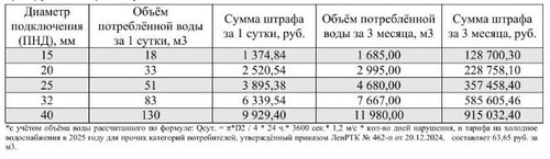 С 01.11.2025 в отношении абонентов или иных лиц, осуществивших самовольное подключение и (или) пользование централизованными системами холодного водоснабжения и (или) водоотведения ГУП «Леноблводоканал», будет прекращено холодное водоснабжение и (или) водоотведение в соответствии с пп.е) п.36, п.63 Постановления Правительства РФ от 29.07.2013 N 644 (ред. от 28.11.2023) "Об утверждении Правил холодного водоснабжения и водоотведения и о внесении изменений в некоторые акты Правительства Российской Федерации". Кроме того, лицам, осуществившим самовольное подключение и пользование централизованными системами холодного водоснабжения и (или) водоотведения, будет начислена стоимость самовольно потреблённых услуг, определённая расчетным способом с применением метода учета пропускной способности устройств при их круглосуточном действии полным сечением в точке подключения к централизованной системе водоснабжения и при скорости движения воды 1.2 метра в секунду (штраф), в соответствии с Постановлением Правительства РФ от 04.09.2013 № 776 «Об утверждении правил коммерческого учета воды, сточных вод». Для заключения договоров и получения дополнительной информации о подключении к сетям холодного водоснабжения и (или) водоотведения, потребителям следует обращаться в абонентский отдел производственного управления Кировского района ГУП «Леноблводоканал» по адресу: Ленинградская область, Кировский район, г. Кировск, ул. Железнодорожная, д. 14Б, тел. 8-(813-62)69-147, e.mail: vodashl@yandex.ru Справочно, размер штрафа за самовольное подключение и пользование*, в зависимости от диаметра трубы, которой осуществлено подключение: