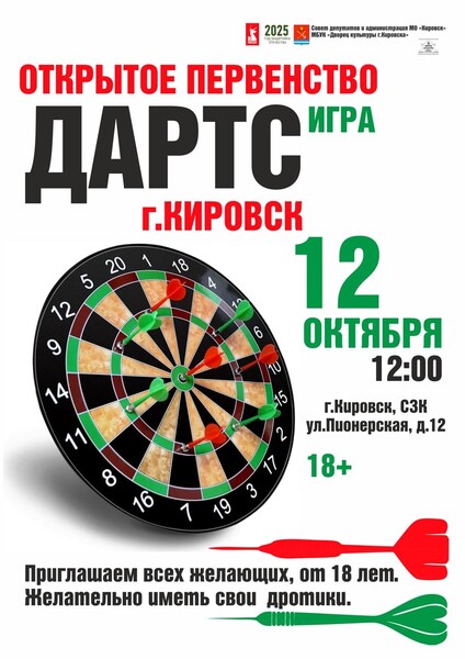 12 октября в Спортивно-зрелищном комплексе города Кировска пройдёт Открытое первенство по дартсу. Начало в 12:00.